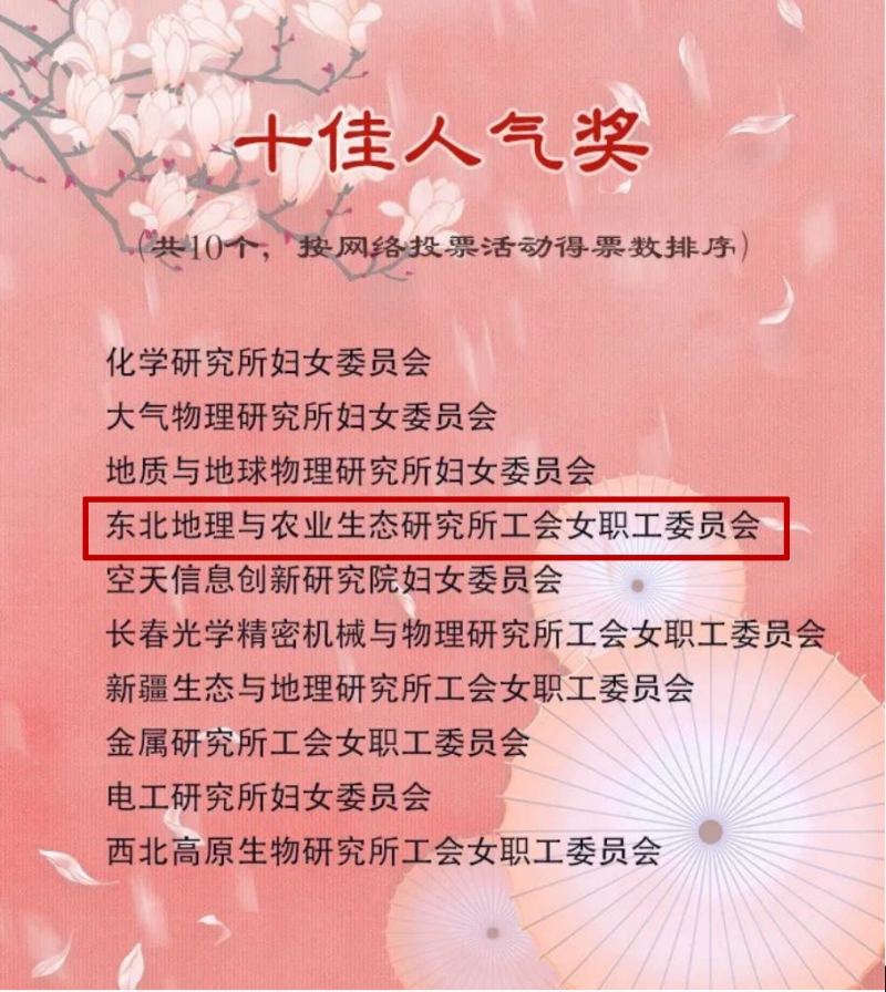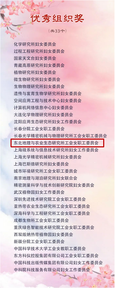 7月7日,中國科學(xué)院婦女工作委員會、中國科學(xué)院工會女職工委員會公布了2022年“科苑女性活動月”獲獎名單,在全院各級婦女組織中,評選出優(yōu)秀組織獎33個,十佳人氣獎10個。其中東北地理與農(nóng)業(yè)生態(tài)研究所工會女職工委員會榮獲"優(yōu)秀組織獎"和"十佳人氣獎"。