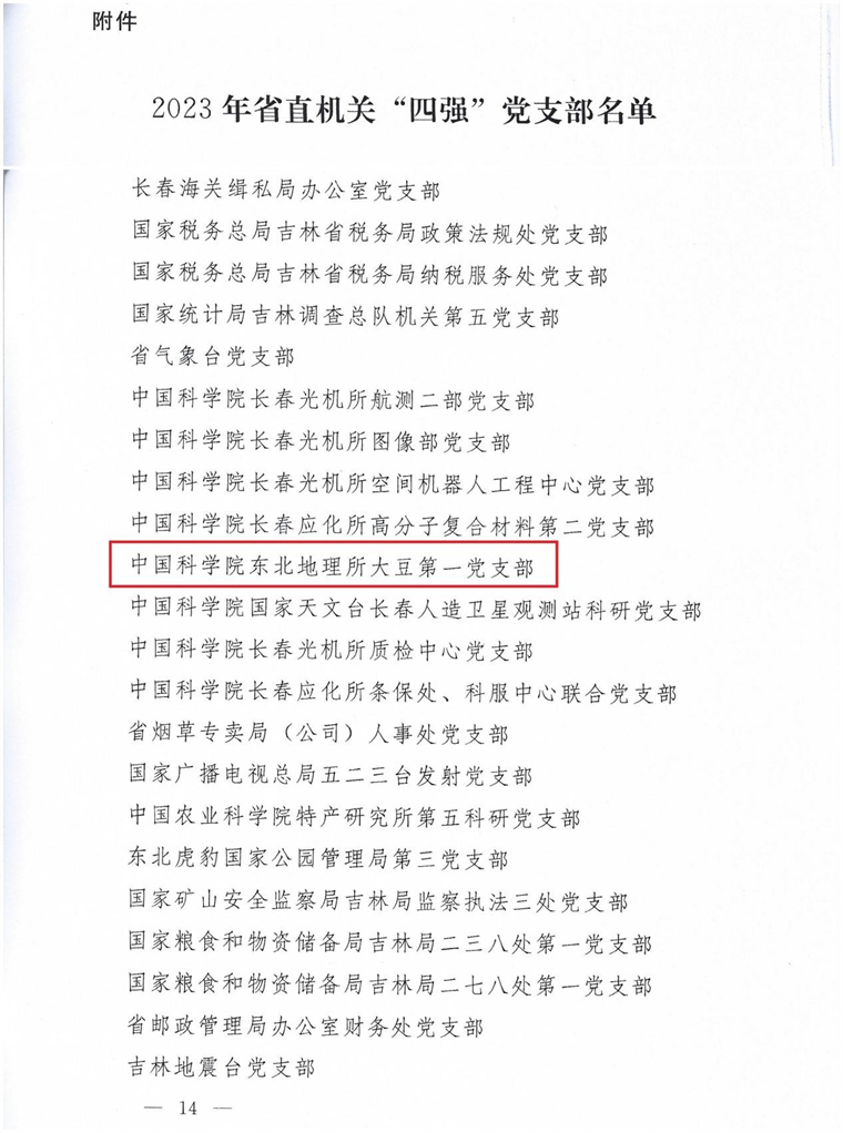 吉林省直機關工委為表彰先進、鼓舞士氣,充分發揮先進典型的示范引領作用,激勵省直機關各級黨組織和廣大黨員干部在新時代新征程展現新擔當、新作為,共命名265個黨支部為“省直機關‘四強’黨支部”,東北地理所大豆第一黨支部位列其中。