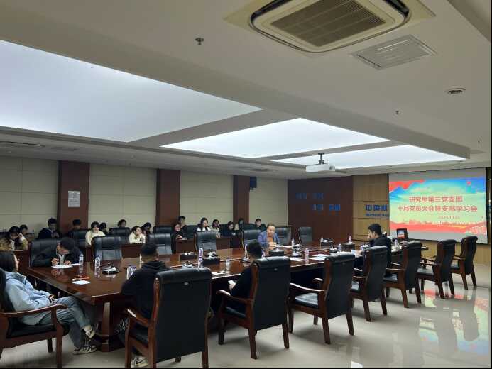 10月25日,研究生第三黨支部在五樓報告廳召開黨員大會開展黨章專題學習交流,會議由支部書記苑春宇主持。