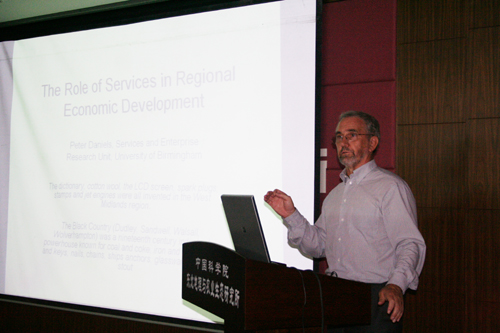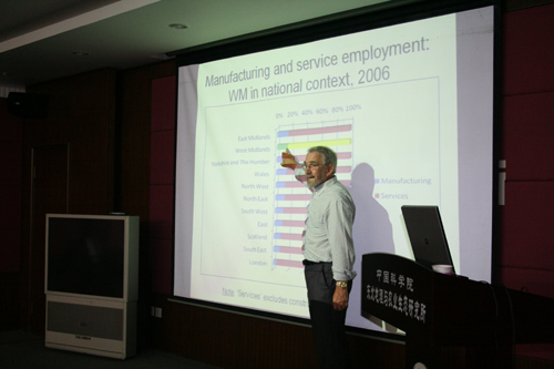 受吉林省外國專家局引智項目資助,英國伯明翰大學(xué)地理\地球與環(huán)境科學(xué)系Peter W Daniels教授于7月20日-26日應(yīng)邀訪問我所進行學(xué)術(shù)交流與合作。7月22日上午Peter W Daniels教授在我所做了學(xué)術(shù)交流報告, 題目是“The role of services in regional economic restructuring”,以英國伯明翰和西米德蘭地區(qū)為例,分析了服務(wù)業(yè)尤其是生產(chǎn)者服務(wù)業(yè)的發(fā)展特征、空間分布規(guī)律和影響因素,對伯明翰和西米德蘭地區(qū)的服務(wù)業(yè)發(fā)展態(tài)勢進行了闡述。張平宇研究員,馬延吉副研究員等科研人員和研究生與Peter W Daniels教授進行了熱烈的討論與交流。