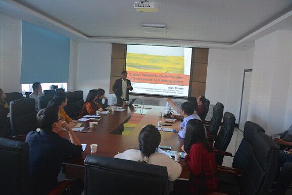 11月20日,Asim Biswas博士做了題目為The spatial variability quantification for soil management的學術報告。Asim Biswas博士簡要介紹了土壤性質(zhì)空間變異性的研究方法后,詳細介紹了小波分析和傅里葉轉化在研究土壤空間變異性方面的優(yōu)勢和應用條件以及傳感器在田間監(jiān)測土壤性質(zhì)中的應用,特別是傳感器的靈敏度和準確度。科研人員和學生共20余名參加了此次報告會。Asim Biswas博士同與會人員就感興趣的問題展開了熱烈討論,大家都表示受益匪淺。