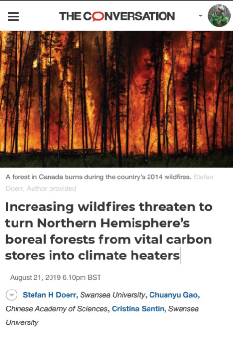 交流期間,雙方就野火領域國際前沿問題進行探討和交流,針對2019年8月21日Nature在線發表的學術論文“Increasing wildfires threaten historic carbon sink of boreal forest soils, Nature, 2019, 572, 520–523”中所闡述的問題進行交流探討,并共同在公眾科普平臺“The conversation”上發表實時評論文章“Increasing wildfires threaten to turn Northern Hemisphere’s boreal forests from vital carbon stores into climate heaters”。針對2014年加拿大森林大火對北方森林以及林下泥炭沼澤中土壤碳庫的影響向公眾進行介紹,并得到Yahoo等國際媒體的轉載。