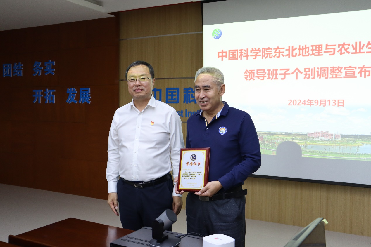 長春分院分黨組書記、院長金宏宣讀了《中共中國科學(xué)院黨組關(guān)于李秀軍同志免職的通知》(科發(fā)黨任字〔2024〕120號(hào)),免去李秀軍同志東北地理與農(nóng)業(yè)生態(tài)研究所副所長職務(wù),保留副局級(jí)。金宏為李秀軍同志頒發(fā)榮譽(yù)證書,感謝其擔(dān)任所(局)級(jí)領(lǐng)導(dǎo)期間為中國科技事業(yè),為院、所改革和發(fā)展做出的重要貢獻(xiàn)。