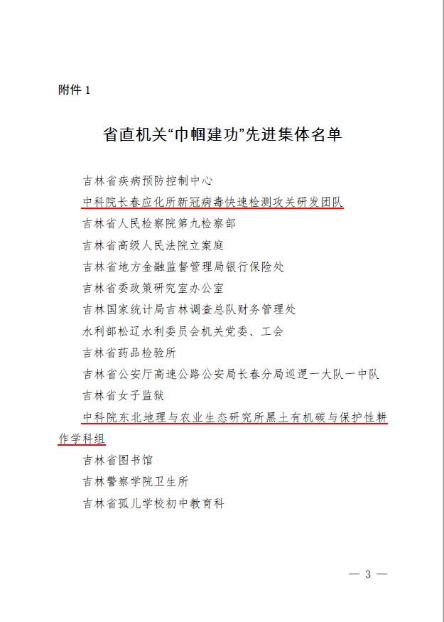 近日,吉林省直婦工委對(duì)吉林省直機(jī)關(guān)“巾幗建功”先進(jìn)集體和先進(jìn)個(gè)人進(jìn)行了表彰,在受表彰的15個(gè)“巾幗建功”先進(jìn)集體中,中科院長(zhǎng)春分院組織推薦的“長(zhǎng)春應(yīng)化所新冠病毒快速檢測(cè)攻關(guān)研發(fā)團(tuán)隊(duì)”和“東北地理所黑土有機(jī)碳與保護(hù)性耕作學(xué)科組”2個(gè)集體均被授予吉林省直機(jī)關(guān)“巾幗建功”先進(jìn)集體榮譽(yù)。