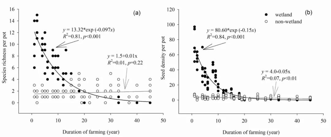 明確了緯度、水深和開墾年限是影響土壤種子庫結構和規模的關鍵限制性環境因素。發現沼澤濕地開墾后,隨著開墾年限的增加,土壤種子庫結構和規模發生變化,濕地物種豐富度及種子密度呈現指數函數快速下降趨勢,而非濕地物種維持在一個穩定的低水平。在開墾1-5年內,土壤中仍含有莎草、禾草、非禾草、灌木四類沼澤濕地植物功能群的種子,濕地植被自然恢復潛力巨大,這類退耕地為濕地自然恢復的優先區域。開墾6-15年內,莎草類植物種子在土壤中消失,而禾草、非禾草、灌木植物的種子在土壤中依然存在,這類退耕地依然具有自然恢復成新生的濕地植物群落的潛力,為濕地自然恢復的次優先區域。當開墾年限在16年以上時,絕大部分濕地植物種子在土壤中消失,非濕地植物逐漸占有優勢,濕地自然恢復難度巨大,這類退耕地需進行濕地植被人工重建。