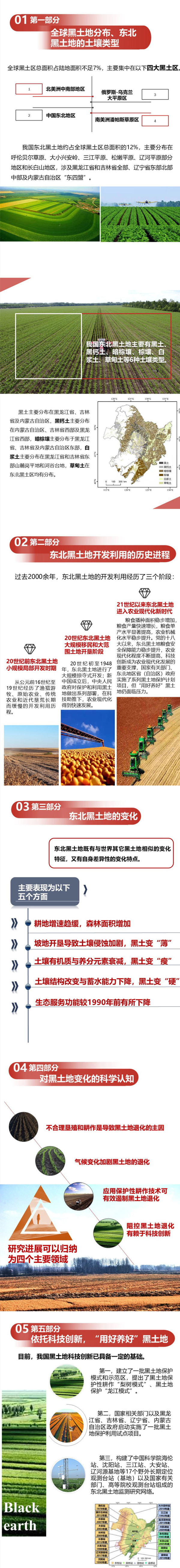 白皮書共分為五個部分。第一部分闡述了全球黑土地分布、東北黑土地的土壤類型;第二部分為東北黑土地開發利用的歷史進程;第三部分為現階段東北黑土地的變化;第五部分為依托科技創新,“用好養好”黑土地。未來“用好養好”黑土地研究的重點方向主要為五個方面:構建黑土地科技創新基礎科技平臺,摸清黑土地本底狀況,提升科技支撐能力;建立黑土地保護與利用科技創新體系,增強區域自主創新能力;打造黑土地保護科技攻關樣板,推進黑土地高質量發展;完善黑土地保護與利用技術標準體系,引導保護利用發展方向;加強國際合作交流,積極參與全球黑土地保護與利用治理。