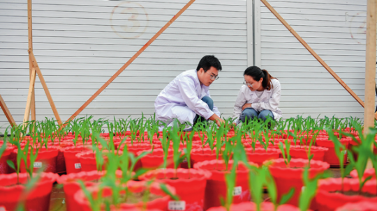 8月2日,吉林省梨樹縣四棵樹鄉(xiāng)三棵樹村“科技小院”,中國(guó)農(nóng)業(yè)大學(xué)博士研究生沙野(左)和在讀碩士郭雯清觀察玉米樣本 張楠攝 / 本刊