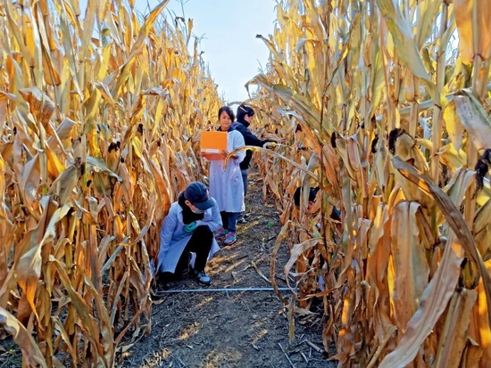 中科院沈陽(yáng)應(yīng)用生態(tài)研究所張旭東研究員團(tuán)隊(duì)成員在保護(hù)性耕作研發(fā)基地測(cè)玉米產(chǎn)量。