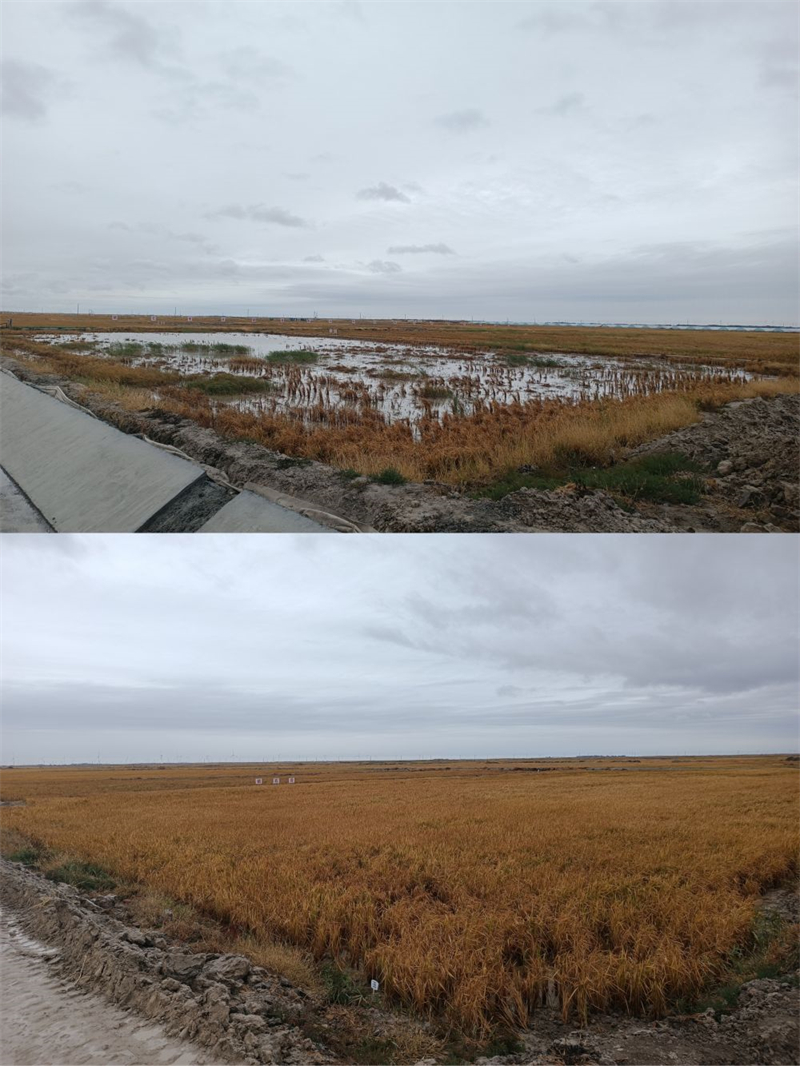 在大安市海坨鄉互助村鹽堿地土壤改良試驗示范基地上,中科院東北地理所改良前(上圖)與改良后(下圖)的鹽堿地對照。新華社記者 李雙溪 攝