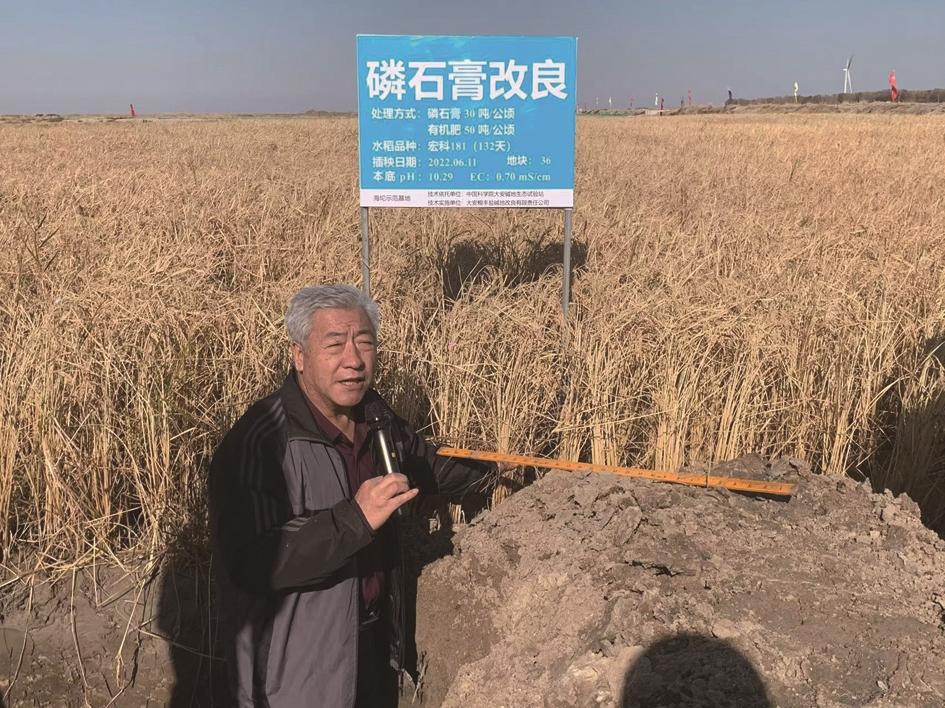 測產要通過收割、丈量、稱重、除水、去雜等嚴格程序。首先進行的收割機進行收割,記者注意到通過土壤改良的稻田地里稻子長勢喜人,在同一塊地沒有經過土壤改良的稻葉已經枯萎。通過土壤剖面可以清晰地看到,改良的鹽堿地泥土發生了巨大變化,稻子根系已經扎得很牢固。而沒有經過改良的稻田地土壤依然白花花一片。通過測產組測產,利用酸性磷石膏改良的重度鹽堿地(改良前土壤pH10.58.EC0.42mS/cm)水稻產量達到每畝517.39公斤,而未實施土壤改良的水田產量僅為每畝35.16公斤,增產高達13.7倍。按此推算,每改造1000畝鹽堿地即可增產糧食100萬斤以上。