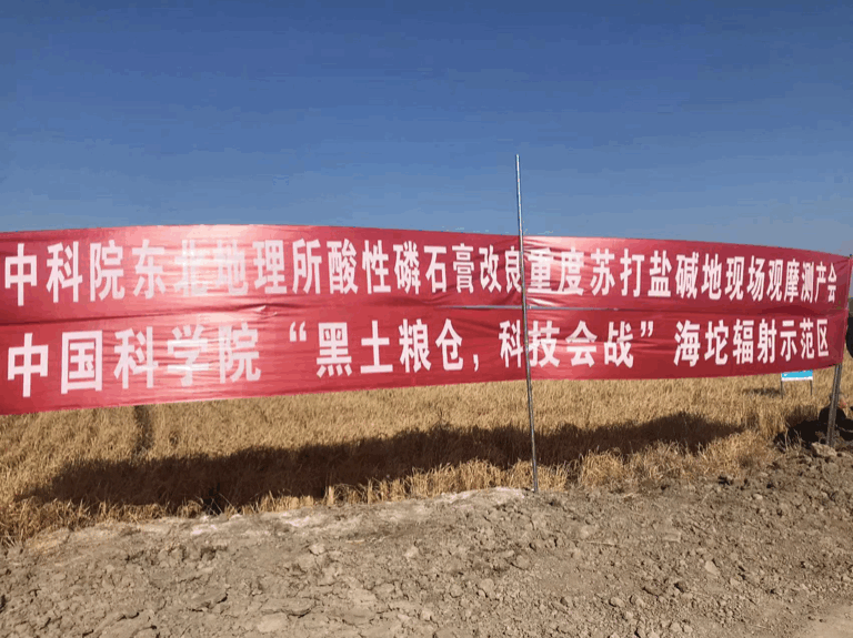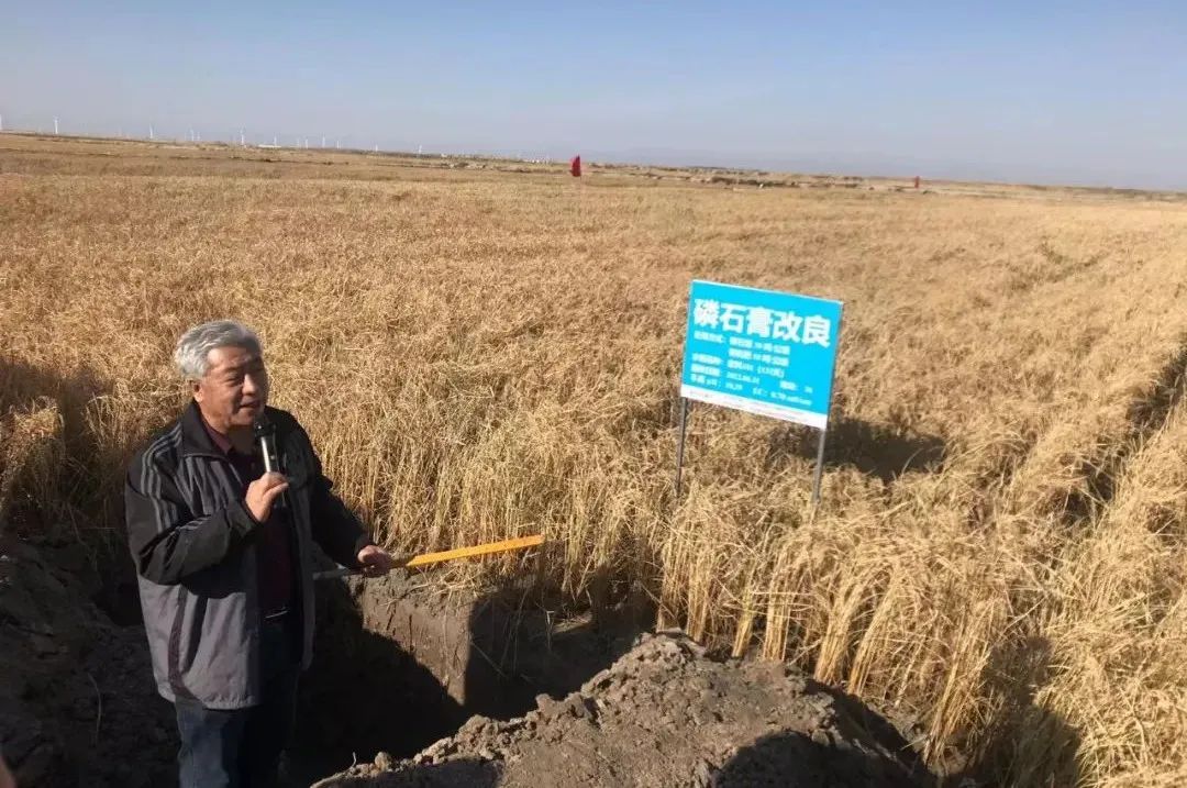 “我們的主要技術(shù)是用酸性磷石膏造良田,大面積改良鹽堿地。把不同的地塊,按照不同的鹽堿程度布設(shè)石膏的用量,經(jīng)過(guò)旋耕、耙地排鹽、洗鹽,然后移栽,后期管理,力爭(zhēng)第一年能夠達(dá)到畝產(chǎn)400公斤以上。”