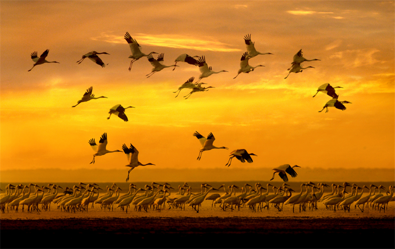 江西鄱陽(yáng)湖國(guó)際重要濕地拍攝到的鶴群。國(guó)家林草局供圖