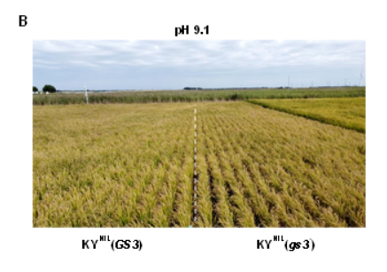 2022年,吉林省大安市鹽堿地中(鹽含量0.3%,pH 9.1)中水稻GS3 近等基因系的生長表型。