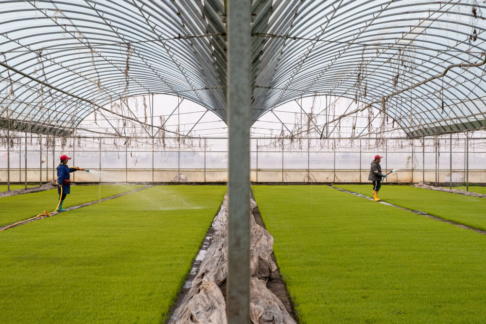 在黑龍江省慶安縣東禾久宏現代農業水稻示范園區育秧大棚內,農民在進行秧苗養護(4月26日攝)。新華社記者 張濤 攝