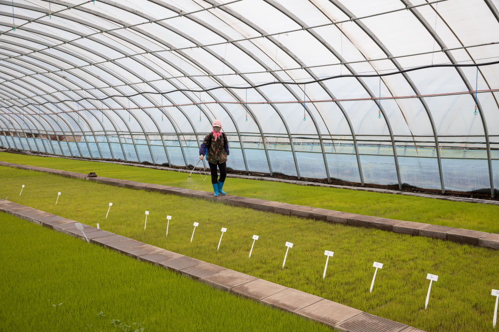在北大荒集團閆家崗農場有限公司農業現代化示范區智能化育秧大棚內,工作人員在噴灑生物菌肥(4月27日攝)。新華社記者 張濤 攝