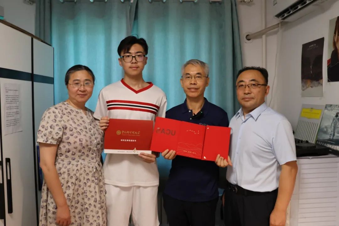 孫奕飛(右三)在家中從國科大數學科學學院副院長郭田德(右二)手中接過自己的高考錄取通知書。丁典攝