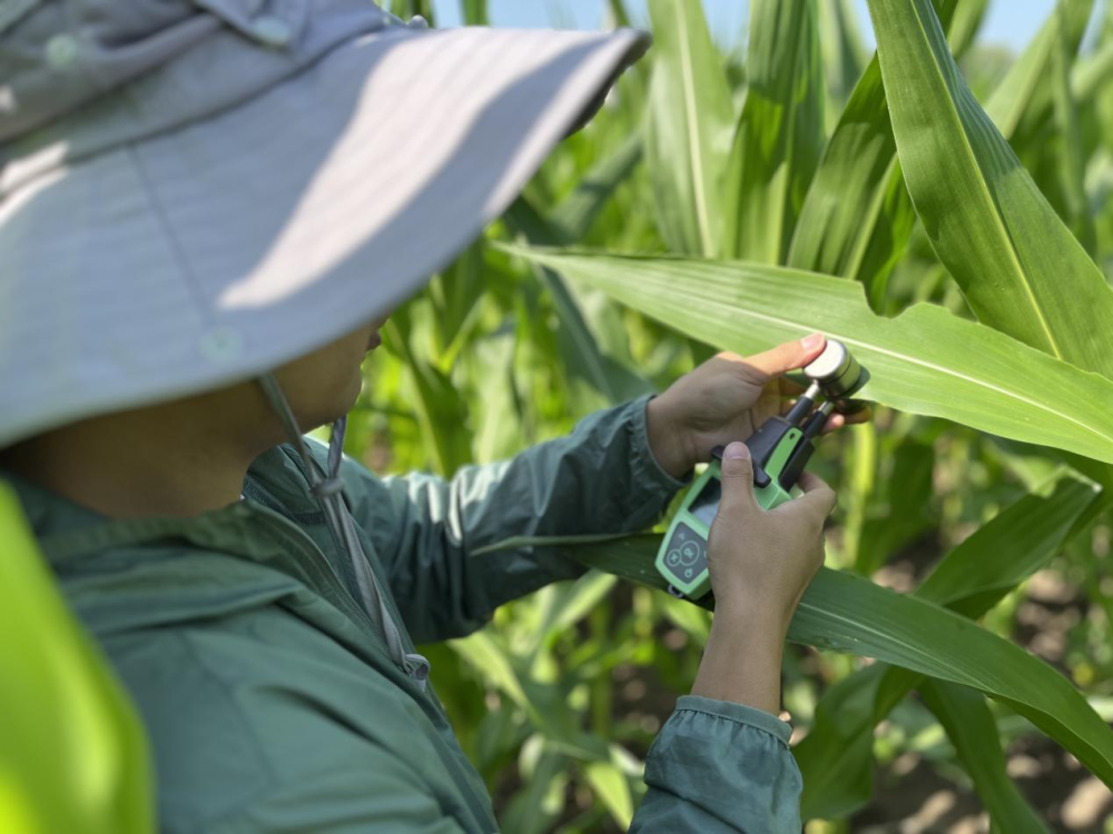 科研人員在田間測植株葉綠素含量。(受訪者供圖)