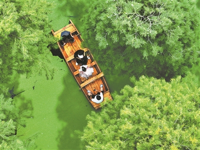 游客在江蘇省揚州市江都區(qū)淥洋湖濕地公園的水上森林乘船游覽。新華社發(fā)(孟德龍攝)