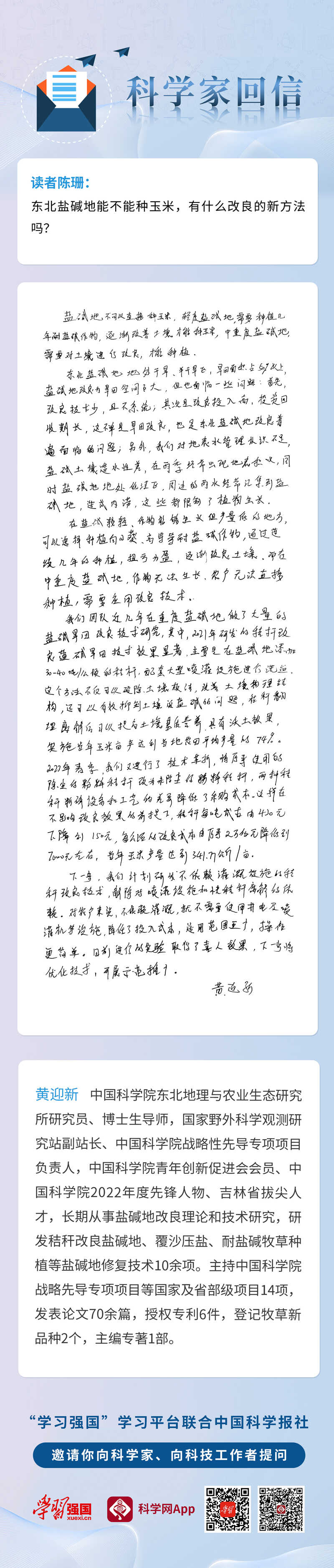 【學習強國】科學家回信|黃迎新:鹽堿旱田改良潛力巨大