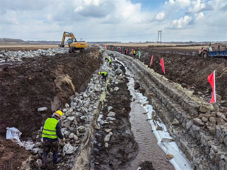 3月20日,在吉林省榆樹市黑林鎮豆坊村高標準農田建設現場,工人們在修繕排水溝渠。新華社記者 薛欽峰 攝