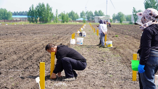 近日,記者在洮北區青山草場的羊草種子擴繁基地看到,科研人員量地塊、分種子、做標記,工作人員則將不同標號的種子播撒在不同地塊,一道道工序有條不紊。