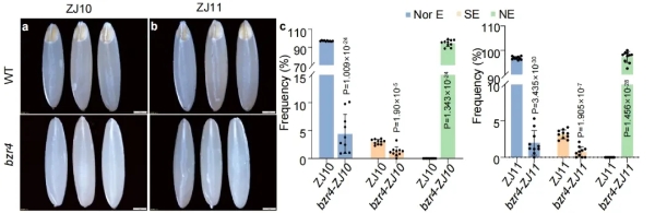 研究團隊發(fā)現(xiàn)了水稻無胚性狀的關鍵調(diào)控基因OsBZR4.在不同栽培品種中突變該基因,均可產(chǎn)生60%至100%的無胚種子。在這些無胚種子中,原本由胚占據(jù)的空腔被胚乳組織完全填充。
