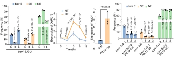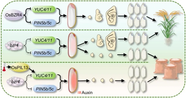深入研究顯示,高溫能夠誘導植物光敏色素互作因子(PIF)家族基因OsPIL13的表達,而OsPIL13又能激活生長素合成基因YUC4的表達,從而加劇OsBZR4功能缺失突變體中生長素的過度積累,最終導致產(chǎn)生更高比例的無胚種子。