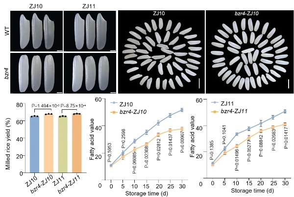 加速老化實驗表明,OsBZR4功能缺失突變體的貨架期比普通米延長了約一倍。這種“一石二鳥”的優(yōu)異特性,證明了OsBZR4基因在水稻育種中巨大的應用潛力。