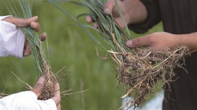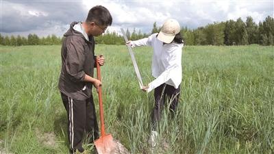 科研人員對(duì)比生態(tài)修復(fù)前后的羊草根系生長(zhǎng)情況。