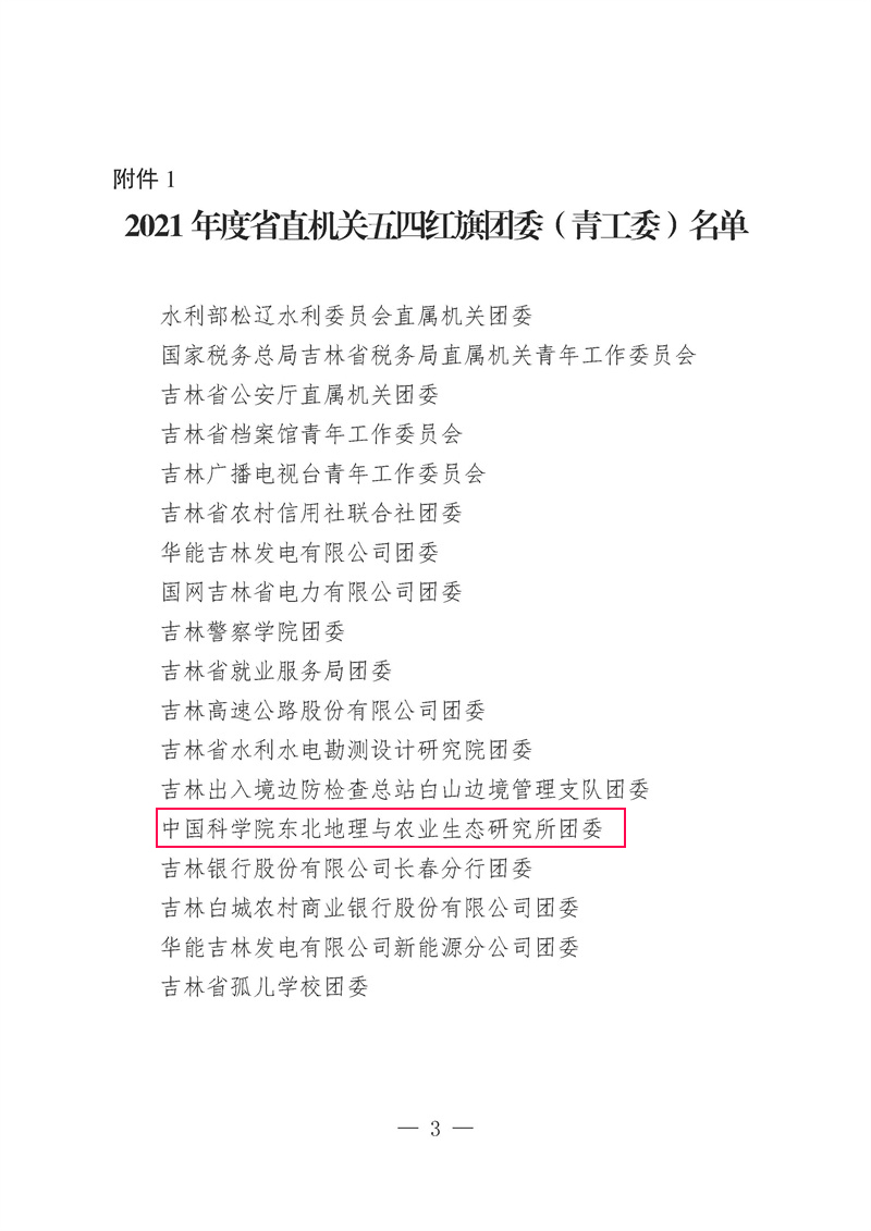 為表揚先進(jìn),激勵團青組織和廣大團員青年奮發(fā)有為、再創(chuàng)佳績,省直機關(guān)團工委對18個五四紅旗團委(青工委)、24個五四紅旗團支部、33名優(yōu)秀團干部、100名優(yōu)秀團員青年進(jìn)行通報表揚。中國科學(xué)院東北地理與農(nóng)業(yè)生態(tài)研究所團委榮獲“2021年度省直機關(guān)五四紅旗團委”稱號,2020級博士研究生楊光義、2019級碩士研究生梁曉璇、2021級博士研究生馮明銘榮獲“省直機關(guān)優(yōu)秀團員”稱號。