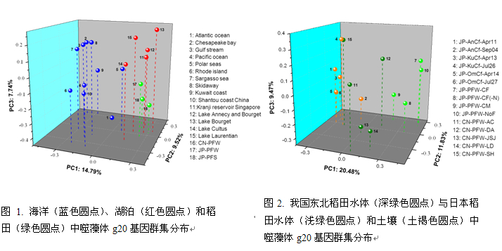 我所農田分子生態(tài)學科組前期研究結果發(fā)現(xiàn),我國東北稻田T4型噬菌體g23基因(編碼主要殼蛋白基因)分布與日本稻田存在一定的差異,兩國間各有一些特殊的類群被發(fā)現(xiàn);同時也發(fā)現(xiàn),基于g23基因群集表征的T4型噬菌體群落結構在稻田、海洋和湖泊環(huán)境中明顯不同,據此認為T4型噬菌體群落結構分布受到地理環(huán)境和生態(tài)過程的雙重影響,而對于其它噬菌體遺傳基因的分布是否也具有相似的規(guī)律還未明晰。為此,東北地理與農業(yè)生態(tài)研究所的博士研究生荊瑞勇在王光華研究員指導下,對東北5個樣點的稻田田面水中噬藻體g20基因分布規(guī)律進行了調查。研究結果發(fā)現(xiàn),我國東北稻田水體存在3個新的g20基因類群(PFW-VII~-IX);采用UniFrac方法分析噬藻體g20基因群集發(fā)現(xiàn),噬藻體群落結構在海洋、湖泊及稻田環(huán)境中存在顯著的差異(圖1),即使在相同的稻田水體環(huán)境中,我國東北稻田水體和日本稻田水體中的噬藻體群落結構也不同(圖2)。該研究結果進一步證明了噬藻體g20基因分布也受到地理環(huán)境和生態(tài)過程的影響。