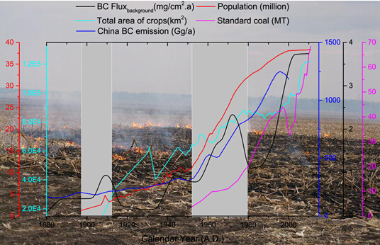 我所濕地生態(tài)系統(tǒng)管理學(xué)科組選擇三江平原典型的泥炭剖面作為研究對(duì)象,結(jié)合210Pb測(cè)年技術(shù),對(duì)三江平原近150年來(lái)黑碳的沉積通量的變化趨勢(shì)及其可能因素進(jìn)行分析。結(jié)果表明,近150年來(lái)三江平原的黑碳沉積通量處于逐漸增加的趨勢(shì)。而在20世紀(jì)初和20世紀(jì)60年代,因?yàn)槿皆笠?guī)模的開(kāi)荒活動(dòng),使得這兩個(gè)時(shí)期的黑碳的沉積通量出現(xiàn)短暫的峰值。通過(guò)廣義相加模型分析發(fā)現(xiàn),20世紀(jì)80年代以后,由于人類活動(dòng)的增強(qiáng),人為因素產(chǎn)生的黑碳逐步成為了三江平原地區(qū)黑碳的主要來(lái)源。