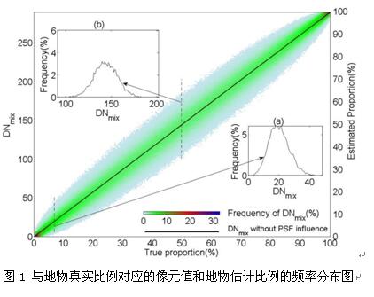 點擴(kuò)散函數(shù)(PSF)是遙感傳感器成像的基本特征,而混合像元分解是遙感信息提取的主要方式之一,PSF必然對混合像元分解結(jié)果產(chǎn)生重要影響,即混合像元分解的PSF空間效應(yīng),它包括不均勻效應(yīng)和鄰近效應(yīng)兩種方式。目前,關(guān)于混合像元分解的PSF非均勻效應(yīng)研究甚少,而對其一般規(guī)律的探討尚未見報道,我所生態(tài)遙感學(xué)科組應(yīng)用成像模擬方法系統(tǒng)研究了混合像元分解的PSF不均勻效應(yīng),研究結(jié)果表明:在傳感器PSF非均勻響應(yīng)作用下,地物比例混合像元分解提取結(jié)果為一個隨機(jī)變量,其概率分布模式為以地物真實比例為坐標(biāo)軸的仿椎體形式;地物比例分解提取的系統(tǒng)誤差和隨機(jī)誤差分別與地物比例估計值之間成負(fù)相關(guān)線性關(guān)系和倒置的拋物線關(guān)系;構(gòu)建了地物真實比例置信區(qū)間的上下邊界曲線數(shù)學(xué)模型,以及地物比例分解提取的不確定性數(shù)學(xué)模型。該項研究首次揭示了傳感器PSF非均勻響應(yīng)對混合像元分解影響的內(nèi)在機(jī)制,并給出了混合像元分解提取的不確定性量化模型,深化了混合像元分解中傳感器PSF非均勻效應(yīng)的全面理解,同時可為遙感影像地物比例混合像元分解的誤差校正與控制提供理論基礎(chǔ)。