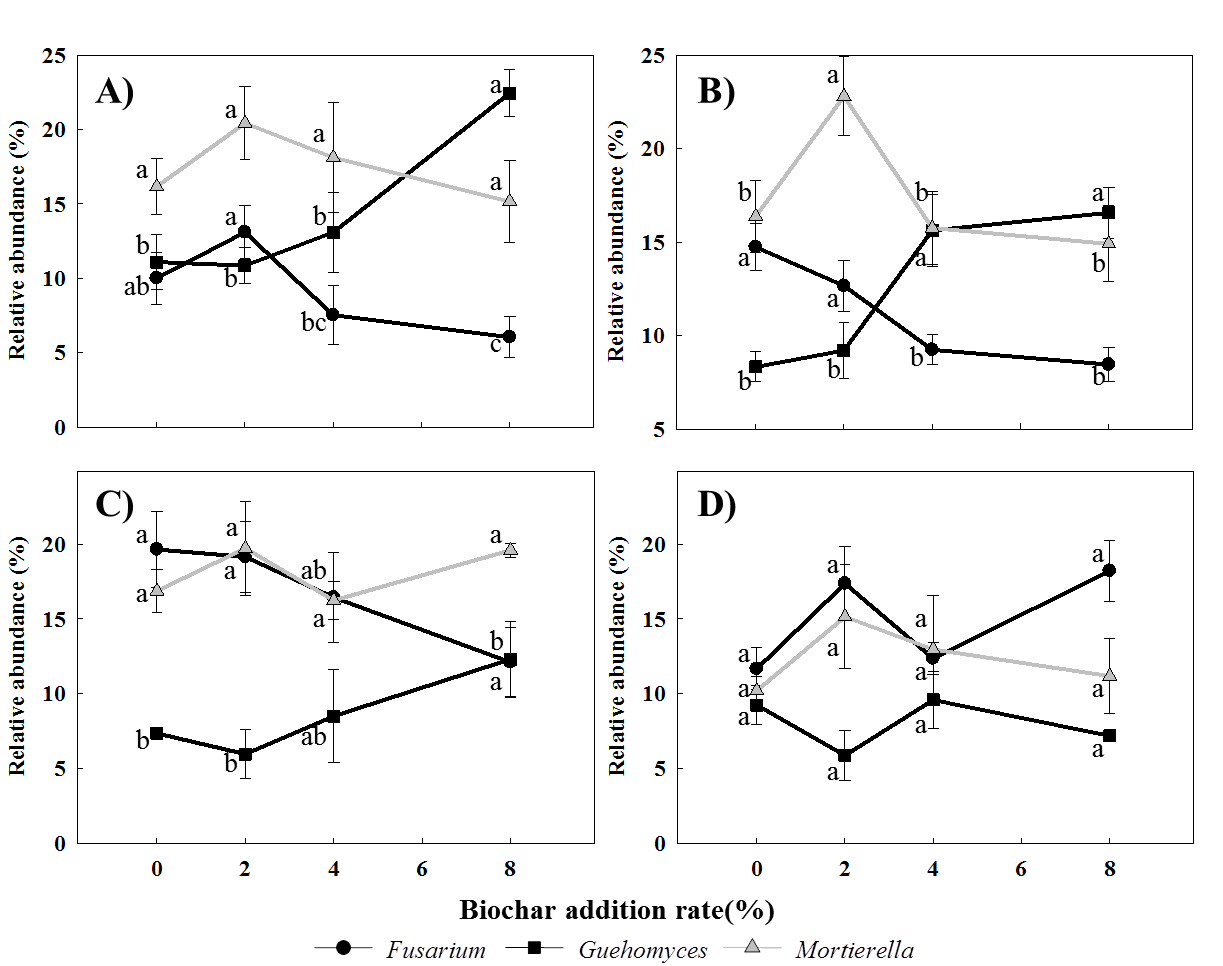 圖2 不同添加量生物炭對優勢真菌屬相對豐度的影響。A、B、C和D分別是采集的4月、6月、8月和10月的土壤樣品。