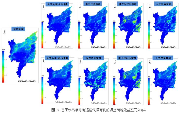 1.研究團(tuán)隊(duì)(1)首次構(gòu)建了針對(duì)濕地水鳥(niǎo)應(yīng)對(duì)氣候變化策略的理論研究框架(圖1);(2)揭示了當(dāng)今和未來(lái)氣候變化情景下東北地區(qū)三江平原東方白鸛棲息地適宜性的空間分布格局(圖2),表明未來(lái)氣候情境下棲息地適宜性分布面積嚴(yán)重下降;(3)揭示了不同氣候適應(yīng)性策略對(duì)棲息地應(yīng)對(duì)氣候變化的效益(圖3),研究顯示“退耕還濕”是最有效的適應(yīng)性對(duì)策,可以使適宜性生境面積提高十倍以上;“建立自然保護(hù)區(qū)”可以提高生境適宜性六倍以上;“人工筑巢”可以提高生境適宜性二倍以上。