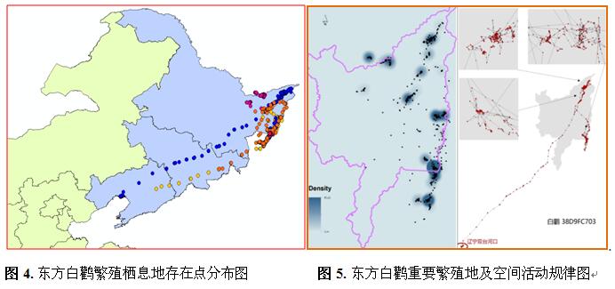 2.研究團(tuán)隊(duì)2016年安裝衛(wèi)星跟蹤器5個(gè)(圖4),觀測(cè)東方白鸛筑巢、覓食等生活習(xí)性,探索相關(guān)生態(tài)環(huán)境因子,明確東方白鸛繁殖重要棲息地空間分布及活動(dòng)規(guī)律(圖5)