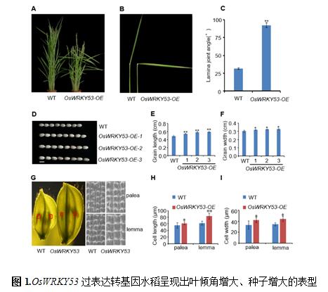 本研究首次發(fā)現(xiàn)水稻轉(zhuǎn)錄因子OsWRKY53能夠正向調(diào)控BR信號(hào),OsWRKY53基因過表達(dá)轉(zhuǎn)基因水稻(OsWRKY53-OE)呈現(xiàn)出葉傾角增大、種子增大、其葉傾角對(duì)外源的BR處理超敏感等一系列BR信號(hào)增強(qiáng)的表型;而敲除突變體(oswrky53)表現(xiàn)出葉傾角變小、種子變小、株高變矮、其葉傾角對(duì)外源的BR處理敏感性下降等一系列BR信號(hào)缺陷的表型。說明OsWRKY53是BR信號(hào)的一個(gè)新的正調(diào)控因子。
