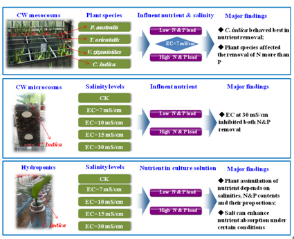 東北地理所水環境污染與防治學科組在對人工濕地處理含鹽廢水的國內外研究進展進行綜述性研究的基礎上(Liang et al., Ecological Engineering,2017),開展了人工濕地處理不同類型含鹽廢水的研究工作。研究發現,在栽種適宜的耐鹽植物后,人工濕地可以對含鹽廢水(EC≦15 dS/m)中的氮磷等營養元素達到較好的凈化效果;鹽度、污染負荷、濕地結構、共存污染物等均在一定程度上影響人工濕地對氮磷的凈化能力;通過優化濕地結構等措施可以保障人工濕地較好的運行效果(Liang et al., Chemosphere, 2017)。