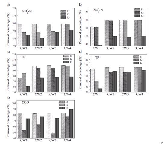 圖1栽種不同植物的水平潛流人工濕地在不同環(huán)境溫度下的凈化效果(CW1:無植物對照; CW2:美人蕉;CW3:千屈菜;CW4:美人蕉與千屈菜混種)
