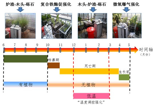 基于上述研究,水環境污染與防治學科組首次提出了以土壤/木頭芯片為核心,集硝化-反硝化、厭氧氨氧化于一體的新型人工濕地污染凈化體系,提出了四季運行/應用模式(圖 1),可為緩釋碳源型人工濕地技術的應用和推廣提供重要科技支撐。