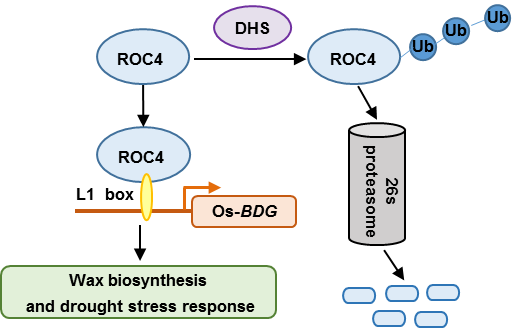 進一步研究發(fā)現(xiàn),DHS具有E3泛素連接酶活性,能夠與HD-ZIP Ⅳ家族轉(zhuǎn)錄因子ROC4相互作用,分析ROC4過量表達植株和基因敲除突變體,發(fā)現(xiàn)ROC4正調(diào)控水稻表皮蠟質(zhì)合成和干旱脅迫反應(yīng);ROC4體內(nèi)蛋白具有泛素化形式,并受泛素/26蛋白酶體(UPS)途徑介導(dǎo)降解;DHS促進ROC4降解,而dhs突變減緩ROC4降解;遺傳學(xué)分析表明,ROC4作用于DHS下游;DHS-ROC4直接調(diào)控下游靶基因Os-BDG的表達。