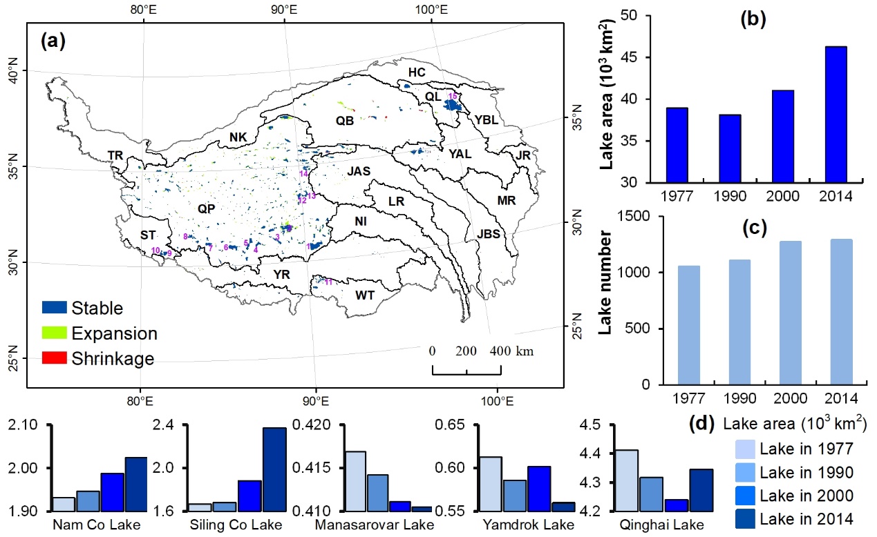 湖泊是氣候變化的重要指示因子,通過探討湖泊的變化及其對氣候變化的響應,有助于理解區域水循環,并為流域水資源管理提供重要的科學決策依據。作為全球第三極的青藏高原,是我國湖泊的第一大分布區,素有“亞洲水塔”之稱,其變化及其原因(氣候變化、冰川融化、凍土退化)一直是國際青藏高原研究學者關注的熱點。青藏高原湖泊變化不僅對生態環境產生重要的影響,而且還會影響到區域歷史宗教文化(如圣湖的變化)。盡管已有一些學者報道了區域湖泊的面積變化特征,但長時間序列的氣候變化對青藏高原湖泊影響的格局與過程尚不明確。