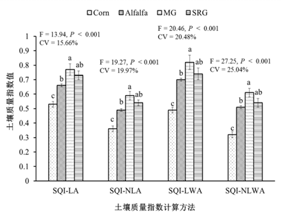 進(jìn)一步的研究表明,松嫩堿化草地土壤質(zhì)量評(píng)價(jià)的最小數(shù)據(jù)集中包括蔗糖酶活性、N:P、可溶性有機(jī)碳含量和不穩(wěn)定有機(jī)碳含量 4個(gè)土壤指標(biāo)。4個(gè)土壤質(zhì)量指數(shù)均能準(zhǔn)確的反應(yīng)出土地利用方式對(duì)土壤質(zhì)量的影響,但由于SQI-NLWA在不同土地利用方式間的差異更明顯,變異性更大,能更敏感的反映出土地管理措施的影響,因此更適合研究區(qū)內(nèi)土壤質(zhì)量的評(píng)價(jià)。苜蓿地、羊草地和自然恢復(fù)草地中土壤質(zhì)量指數(shù)均較高,表明草地恢復(fù)顯著改善了研究區(qū)內(nèi)的土壤質(zhì)量。