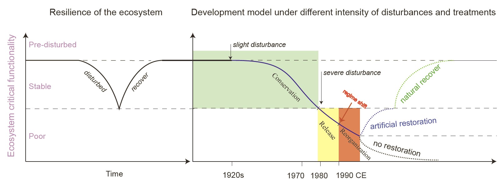 濕地生態系統相較于湖泊、河流生態系統等有著更強的彈性。對受損的濕地進行恢復,可以把該濕地“釋放”階段之前的生態特征作為濕地恢復的參考目標,之后濕地可通過自身的恢復力恢復到干擾前的狀態,從而節約人工恢復成本和保持濕地恢復后的穩定性。本研究得到國家自然科學基金(41571191; 41701217)和國家重點研發計劃(2016YFA0602301)的資助。相關研究成果發表在《Ecological Indicators》、《Science of the total Environment》上。