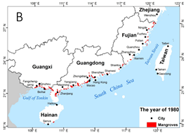紅樹林是生長在熱帶、亞熱帶海岸潮間帶或河流入海口的木本植物群落,具有防風消浪、保護灘涂、凈化海水和促淤造陸等重要作用,是國際上濕地生態保育和生物多樣性保護的重要對象。然而近半個世紀以來,人類活動和自然環境的變化導致紅樹林資源急劇減少,全球35%的紅樹林在此期間消失。紅樹林不可取代的生態、經濟、社會效益,以及面臨著自然和人為雙重脅迫下急劇銳減的嚴峻形勢,使得紅樹林保護和管理越來越受到世界各國的重視。在中國,上世紀后50年紅樹林遭到嚴重破壞,其損失速率顯著高于世界平均水平。自20世紀90年代中期開始,中國政府頒布了一系列紅樹林保護的法律和條例,但是關于紅樹林保護成效的研究甚少。特別是在國家尺度上,紅樹林保護的成效如何?各個保護區的建立是否起到了保護當地紅樹林的作用?等等相關問題還沒有明確的答案。這些問題的解答對于制定合理的濱海濕地保護、恢復和資源利用政策意義重大,對于建設“美麗中國”這一生態文明目標的相關工作也具有重要的借鑒意義。