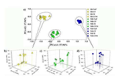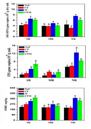 為了維持和提高農(nóng)田土壤生產(chǎn)力,向土壤中施加肥料已成為常規(guī)的農(nóng)業(yè)生產(chǎn)管理措施。國內(nèi)外許多資料表明,肥料管理對土壤微生物影響明顯,但不同區(qū)域的研究結(jié)果不盡相同。東北黑土是地帶性土壤,前期研究發(fā)現(xiàn)東北黑土農(nóng)田土壤微生物存在明顯的地理分布格局,但長期相似的施肥管理能否驅(qū)動不同地點的微生物群落結(jié)構(gòu)具有趨同性?有機肥和化肥對黑土區(qū)土壤微生物如何影響?為回答上述問題,東北地理所農(nóng)田分子生態(tài)學科組與相關(guān)單位合作,從黑土區(qū)南部公主嶺(SB)、中部哈爾濱(MB)和北部黑河(NB)3個長期定位施肥試驗站,選取4種相似的施肥制度:NoF(無肥),CF(單施化肥),M(單施有機肥)和CFM(化肥有機肥配施)的耕層土壤為研究對象,采用熒光定量PCR和Illumina Miseq高通量測序技術(shù),對比研究了長期相同施肥制度下3個地點土壤微生物豐度及群落結(jié)構(gòu)分布特征,以及長期不同施肥制度對單個地點土壤微生物豐度及群落結(jié)構(gòu)的影響。研究發(fā)現(xiàn),施用有機肥增加了黑土區(qū)土壤微生物豐度和土壤微生物量碳含量(圖1),顯著增加富營養(yǎng)型細菌和植物有益真菌的含量(圖2);而化肥的添加會導致潛在植物致病真菌含量的增加(圖3)。研究同時發(fā)現(xiàn)3個地點盡管經(jīng)歷了長期不同的肥料處理,但相同的施肥方式并沒有驅(qū)動土壤微生物向同質(zhì)化方向演替,地域差異仍是決定東北黑土區(qū)土壤細菌和真菌群落結(jié)構(gòu)組成的主導因素,長期不同施肥管理僅在局部地區(qū)對土壤微生物群落產(chǎn)生微調(diào)作用(圖4和圖5)。該研究進展進一步佐證了黑土農(nóng)田土壤微生物地理分布格局的存在,同時也表明黑土帶上“一方水土生存一方微生物”。