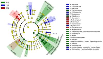 圖4大豆輪作和連作條件下真菌群落LEfSe分析進化分枝圖