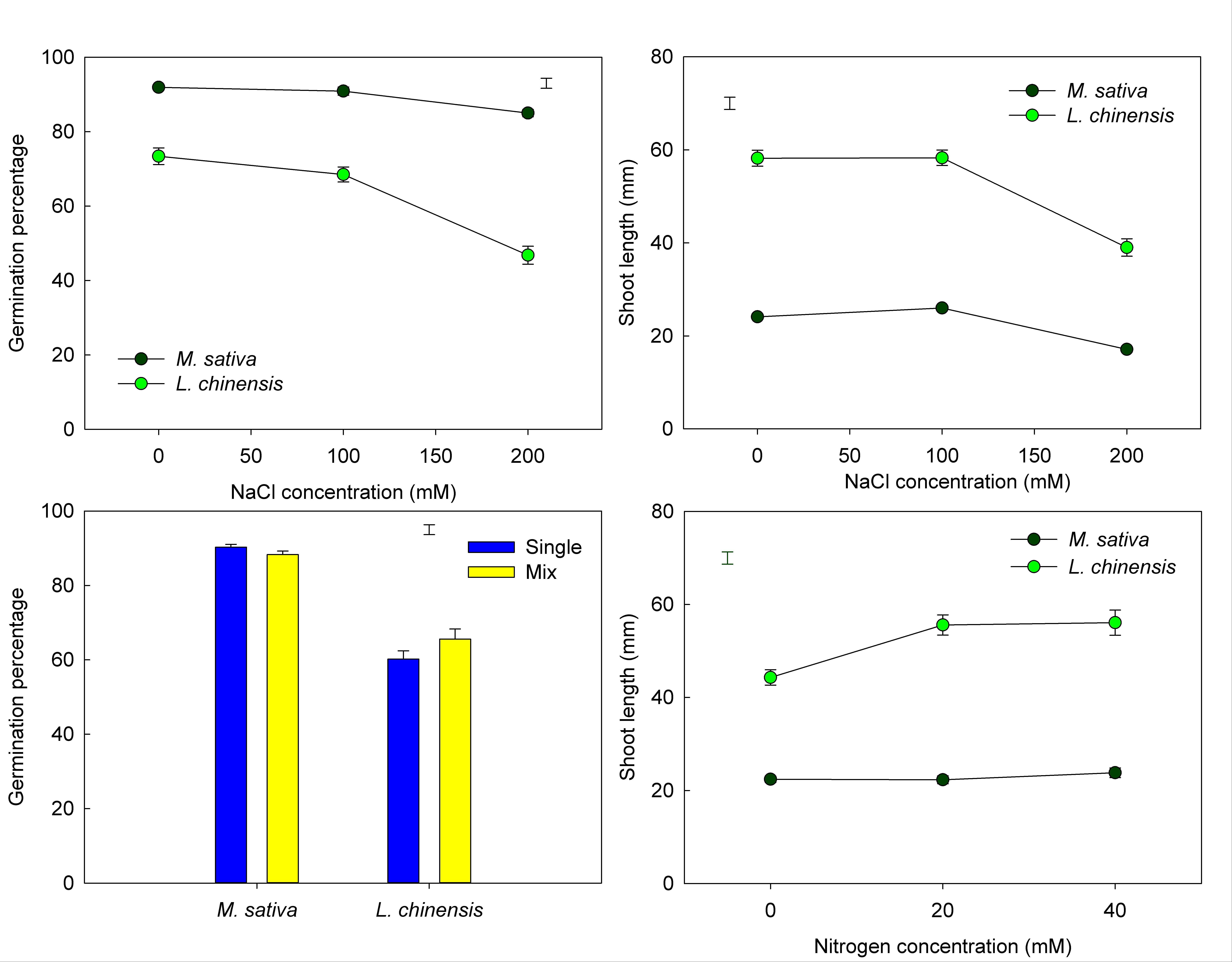 為了研究鹽和氮的交互作用對優質牧草禾本科羊草(Leymus chinensis)和豆科紫花苜蓿(Medicago sativa)早期生長的影響,東北地理所草地農牧業學科組科研人員開展了一個2×2×3×3析因設計實驗,兩種牧草在三個鹽濃度(0、100、200 mM NaCl)、三個氮濃度(0、20、40 mM NH4NO3)單播和混播條件下進行萌發。研究結果表明,混播和氮添加顯著增加氮敏感物種羊草的發芽率、發芽速度和幼苗高度,而對固氮植物紫花苜蓿種子的萌發和幼苗生長影響不大(圖1)。苜蓿幼苗的鈉離子含量隨鹽濃度和氮濃度的增加而增加,氮含量保持相對穩定;而羊草幼苗的鈉離字含量保持穩定,氮含量在加氮條件下顯著增加。因此我們推測羊草和苜?;觳l件下,苜蓿吸收鈉離子形成“微-生物治理micro-bioremediation”環境,使羊草吸收氮素作為養分和滲透調節劑,促進其種子萌發和早期生長。