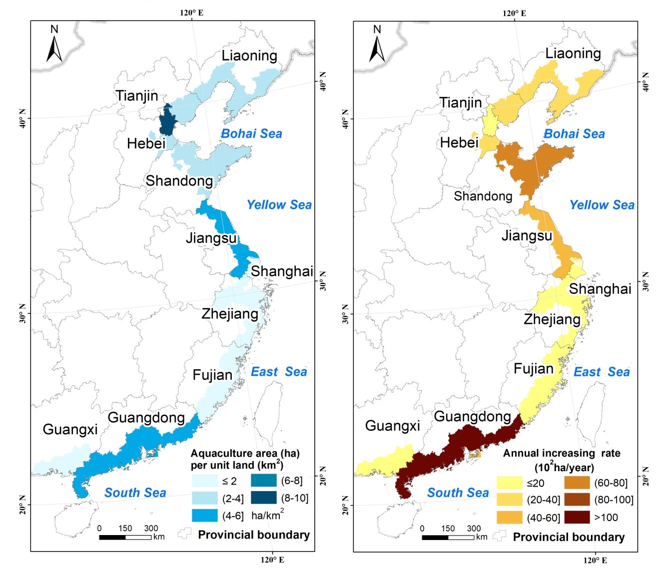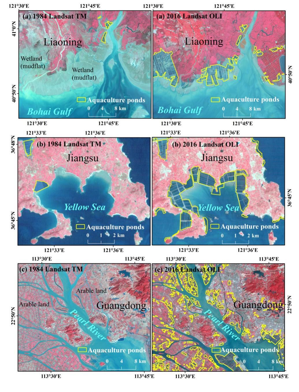 研究發(fā)現,截止到2016年,中國濱海養(yǎng)殖池塘擴張面積達10,463 km2 ,約為80年代初期面積的4倍,其中,廣東、山東、江蘇是濱海養(yǎng)殖池塘擴張的熱點地區(qū)。近32年來,大部分沿海省市養(yǎng)殖池塘均呈持續(xù)增加的趨勢,1990-2000年間擴張最為劇烈,且主要發(fā)生在海岸線向陸一側的10公里緩沖帶范圍內。養(yǎng)殖池塘擴張的主要土地覆被來源是濱海濕地(包括灘涂、紅樹林、蘆葦沼澤等)和耕地類型。政府導向的濱海土地開發(fā)政策、改革開放帶來的經濟飛速發(fā)展等是造成濱海養(yǎng)殖池塘快速擴張的主要驅動因素,而濱海天然濕地損失、水質惡化等則是養(yǎng)殖池塘擴張最直接和主要的環(huán)境影響。