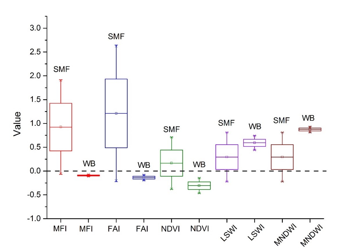 圖3. 不同植被指數中淹沒紅樹林像元與水體像元值分布箱形圖
